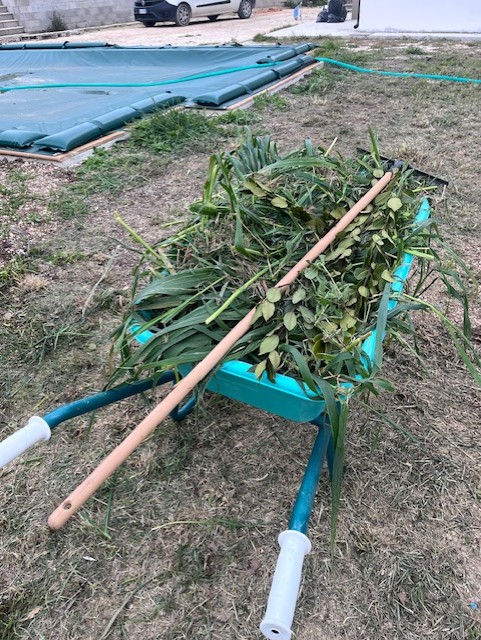 Vandaag begon de dag met het verwijderen van al het onkruid rondom het zwembad. We willen natuurlijk een mooi grasveld dadelijk! 🙂