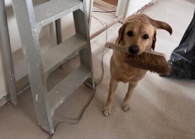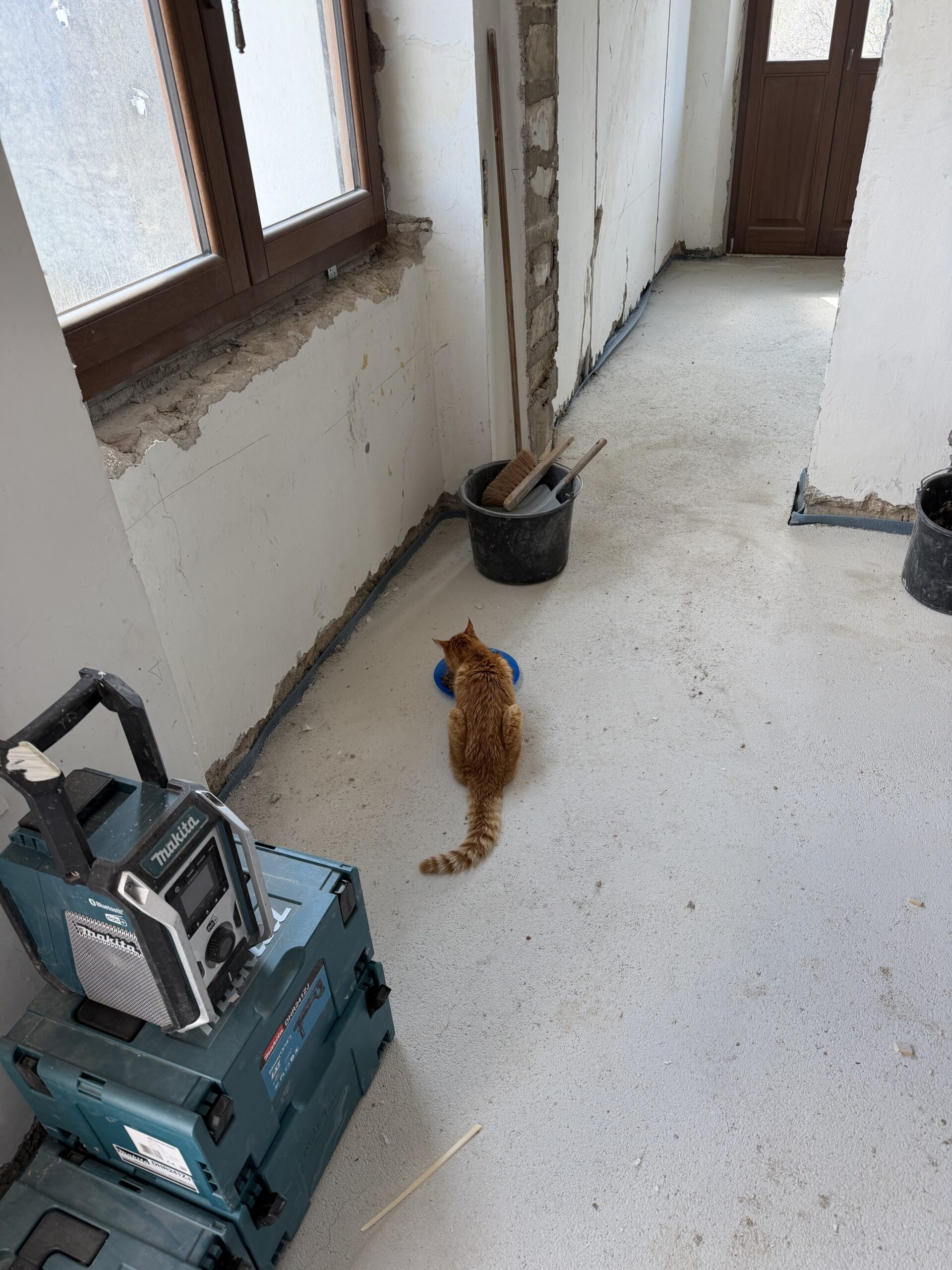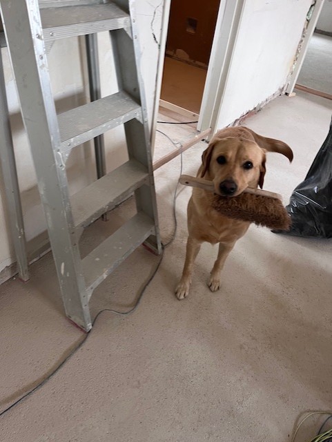 Soof begrijpt wat er moet gebeuren na het hakken in de muren en komt de veger netjes brengen! 🙂