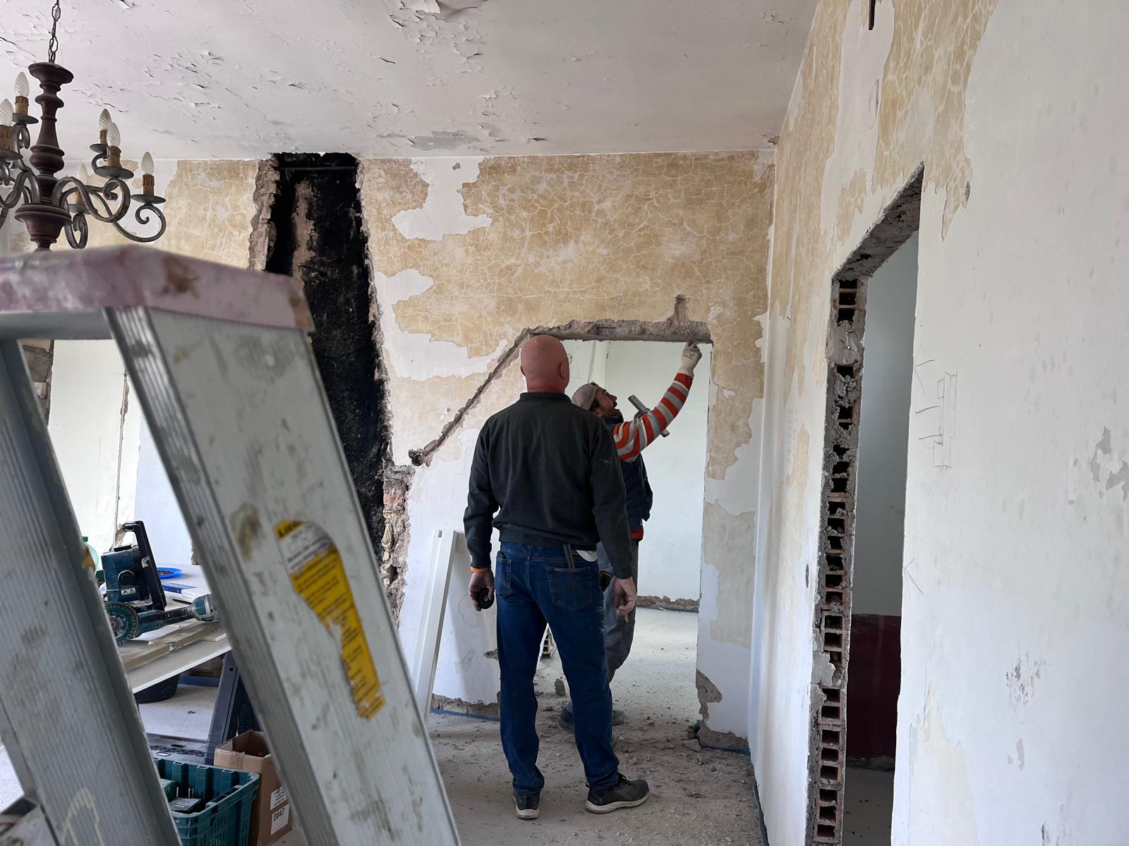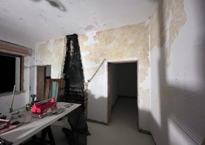 Na de lunch tot een uur of 21:00 zijn we druk, maar aan het einde van de dag zit én alle elektriciteit er in én zijn de muren en plafonds kaal!