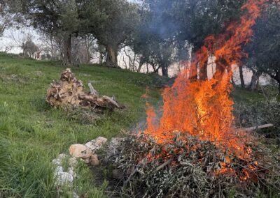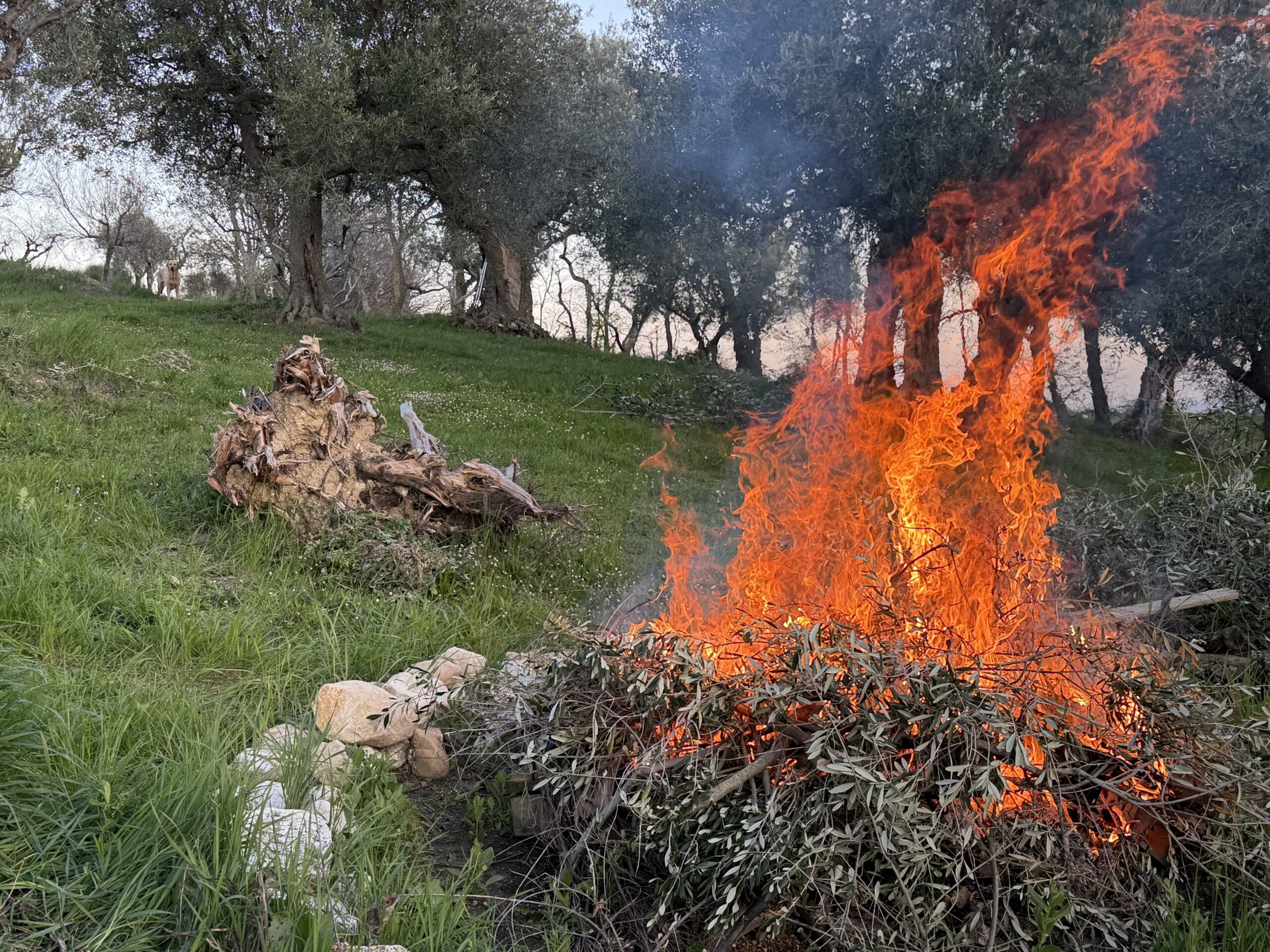 Met dit weer en het weersvooruitzicht voor morgen (Net zo’n mooie dag als vandaag) besluiten we dat het handig is om alvast de olijfbomen te gaan snoeien. Dit mag uitsluitend met droog weer en moet in Maart/April/ Mei. Het snoeiafval van de eerste drie bomen was al genoeg voor ca. 3 aanhangwagens vol snoeiafval, dus na 27 olijfbomen.. Tijd voor een vuurtje!
