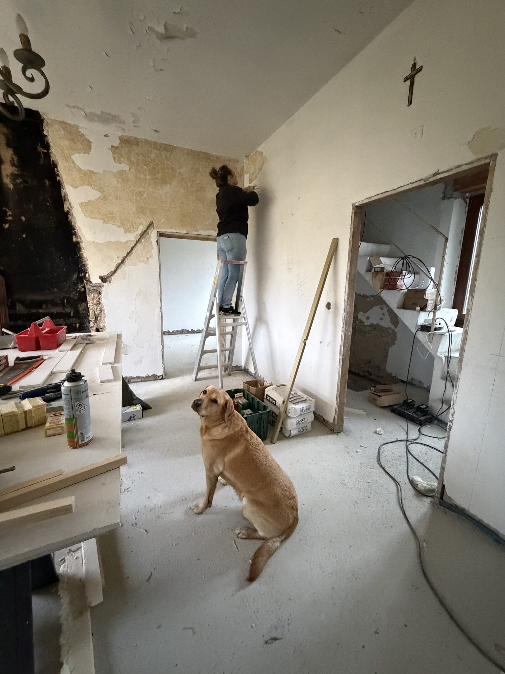 Van haar taak voor vandaag is het volledig afsteken van alle oude verf, terwijl Den vandaag alle dozen voor de elektriciteit 💡🔌⚡️in de muren wilt hebben.