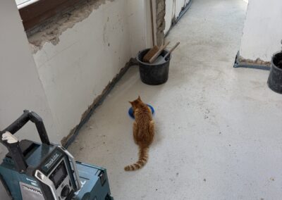 Binnen begonnen met het op niveau brengen en glad strijken van de vloer. Stoof heet nog even geprobeerd het werk te saboteren, maar uiteindelijk konden we verder 😉