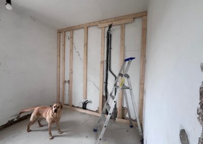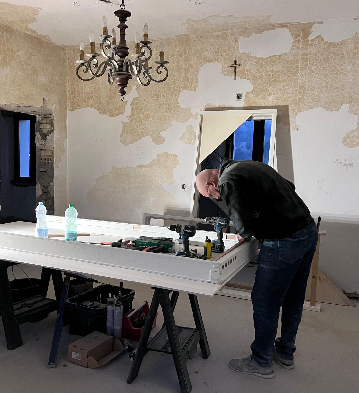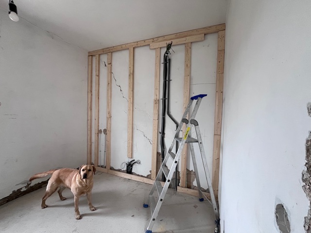 Den maakt de houten omlijsting voor de badkamermeubels én we besluiten nog even elektriciteit door te trekken voor een buitenlamp 💡!