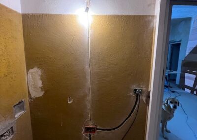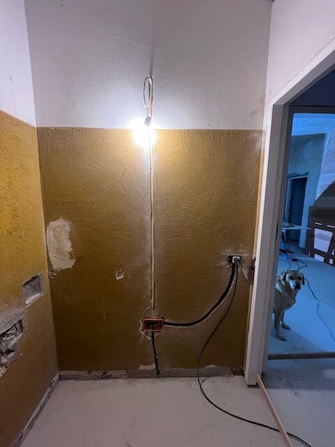 Terwijl Van en Soof vanochtend echt een uurtje langer nodig hebben, is onze bikkel al vroeg aan de slag om alle electriciteit in de muren te krijgen..